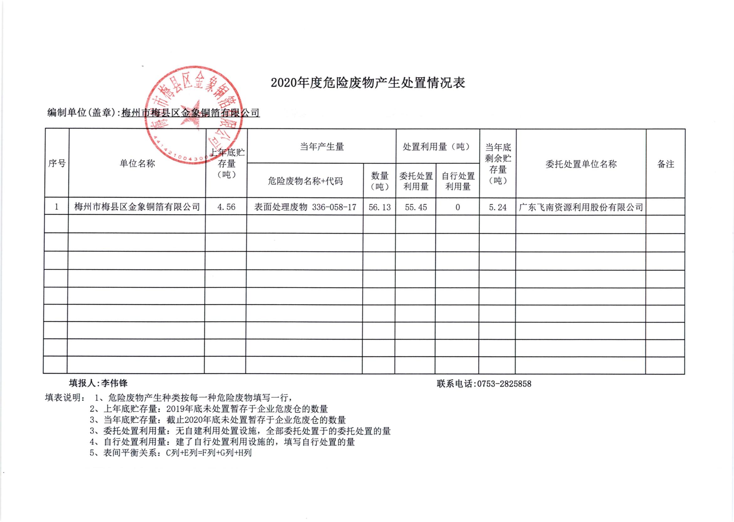 梅州市梅縣區(qū)金象銅箔有限公司系廣東嘉元科技股份有限公司的全資子公司,現(xiàn)將梅州市梅縣區(qū)金象銅箔有限公司國家排污許可證中固廢污染防治信息進(jìn)行公示。