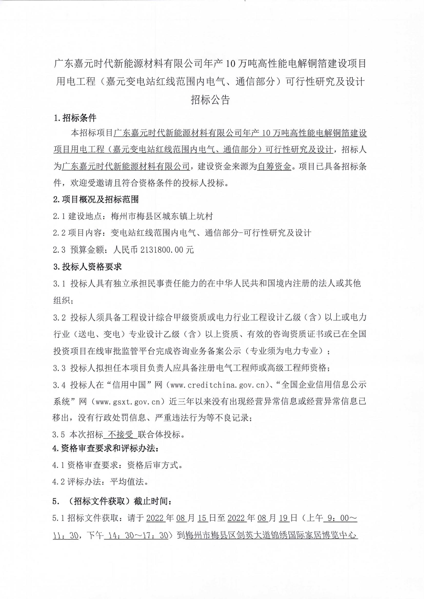 廣東嘉元時代新能源材料有限公司年產(chǎn)10萬噸高性能電解銅箔建設(shè)項(xiàng)目用電工程(嘉元變電站紅線范圍內(nèi)電氣、通信部分)可行性研究及設(shè)計招標(biāo)公告
